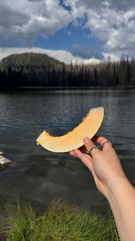 At night, Mekah made us kabob burgers over fire with roasted veggies like zucchini, eggplant, onions, and more. We inhaled it all with heaping spoonfuls of mast moosir after spending the whole day hiking the waterfalls and swimming in the lake. The next morning, I roasted sweet potatoes over the fire for breakfast. Lonoe brought this beautiful mulberry preserve that he had made from the mulberries he harvested, and I poured it all over a bowl of cottage cheese, topped it with pepitas and olive oil, and served it with lots of bread that I toasted over the fire per order. We left our campsite and drove further north into Burney Falls and Mount Shasta that day. Lonoe made us hot dogs with caramelized onions over the fire, and we enjoyed some chips dipped in yogurt as we cooked and prepared dinner.