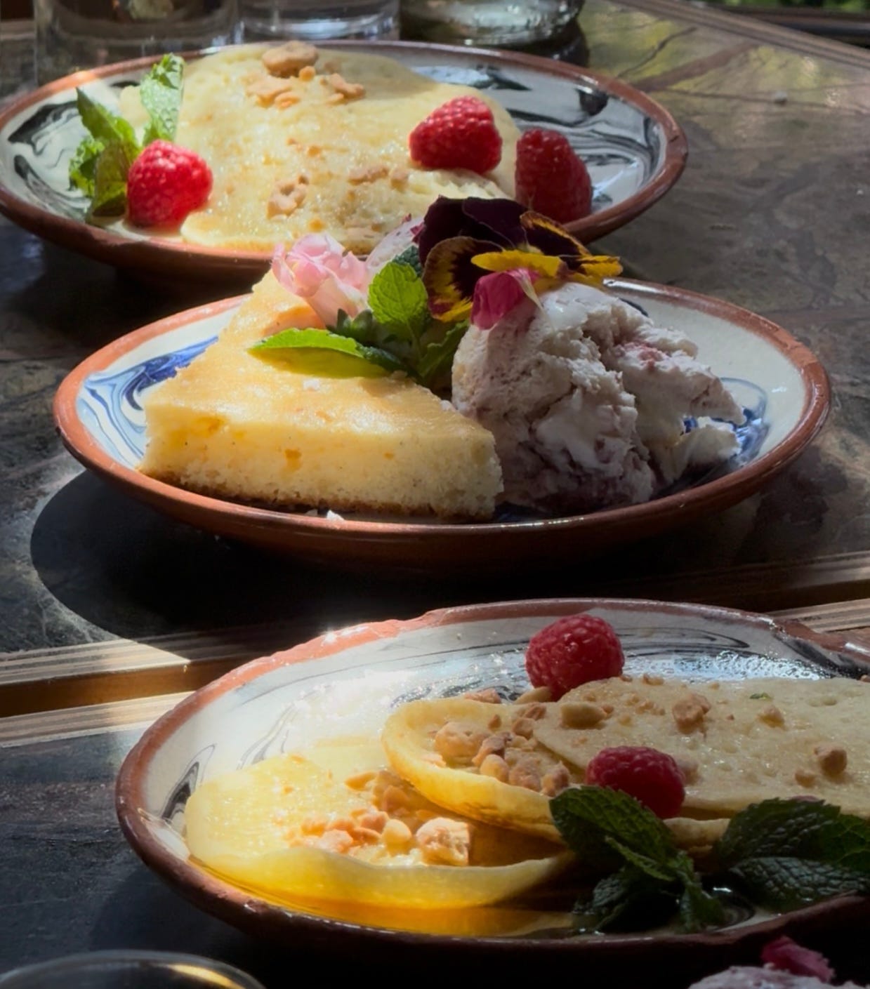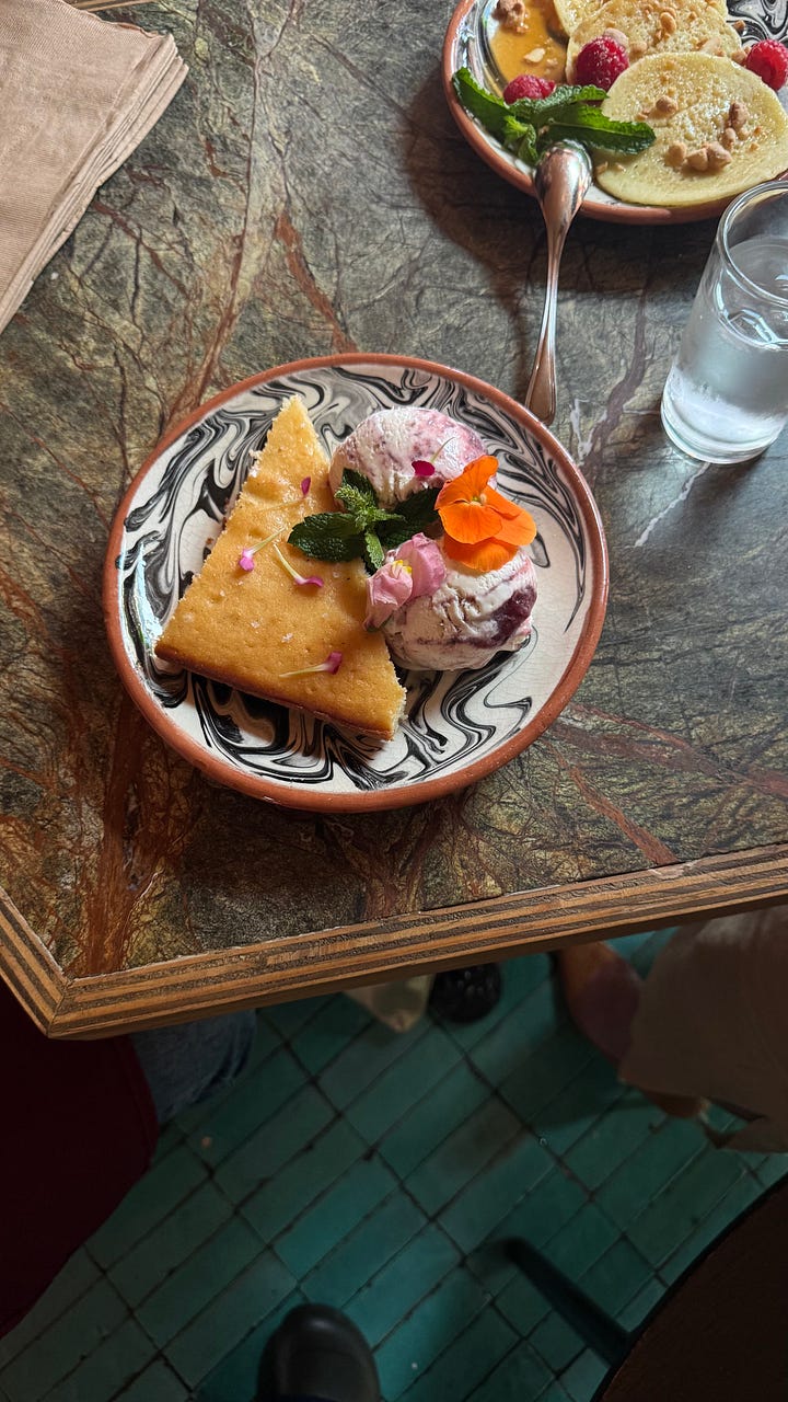 Mirza Shakshuka followed this course, and we concluded with a two-course dessert: labneh orange blossom ice cream with honey-stewed plums and a cardamom cake by moi, alongside Baghrir, Moroccan semolina pancakes smothered in orange blossom honey and butter.