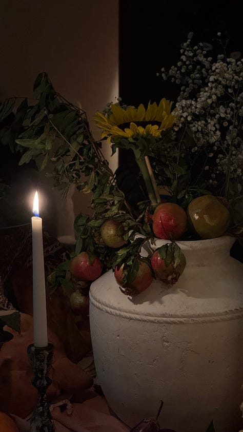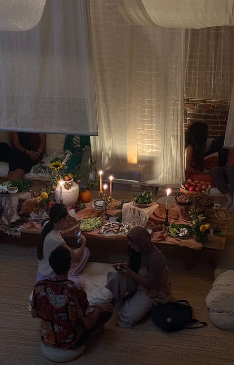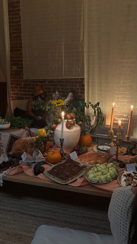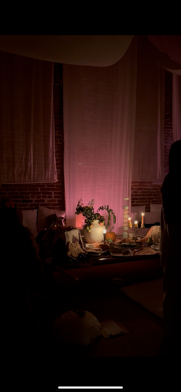 People were brought together around the table from different parts of the country and even the world (!), to sit in ritual and connection with the earth, the seasons, each other, and therefore their own selves. We meditated in the candlelight, breathed together, and journaled to set our intentions for what we wish to shed or walk into in the new season with. We built a community altar with our offerings and our intentions. We danced into the night together to welcome in a season of ease and introspection.