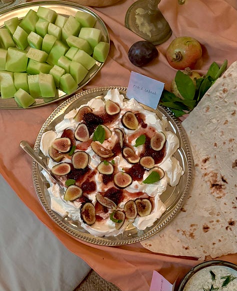 Some of the treats on the seasonal food altar included labneh with fig & fig leaf jam, cardamom bergamot cake, eggplant pomegranate dip, fresh bread, butter, honey, and jams, cucumber yogurt dip, noon panir sabzi, and a variety of nuts and fresh fruits of the season.