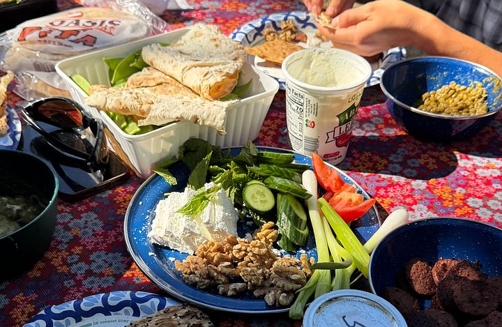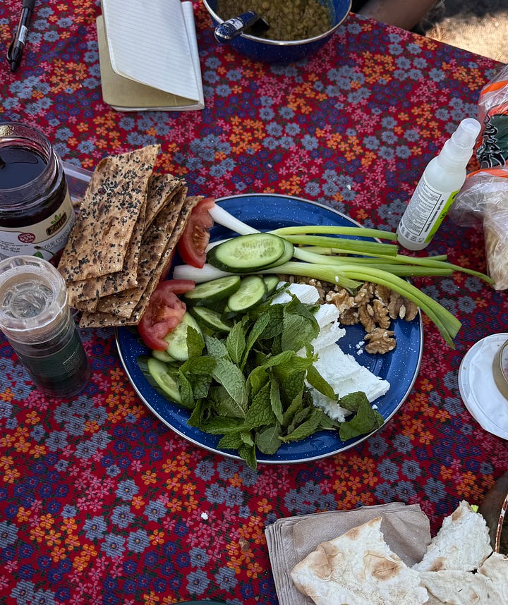 Each day, we had different people in charge of breakfast or dinner. We arrived in the evening and enjoyed delicious olovieh (potato salad) sandwiches made by my aunt and Sogol. On the first morning, Hossein made adasi, a lentil soup, and together with Scheherazade, they set up a Persian breakfast picnic table by the lake.